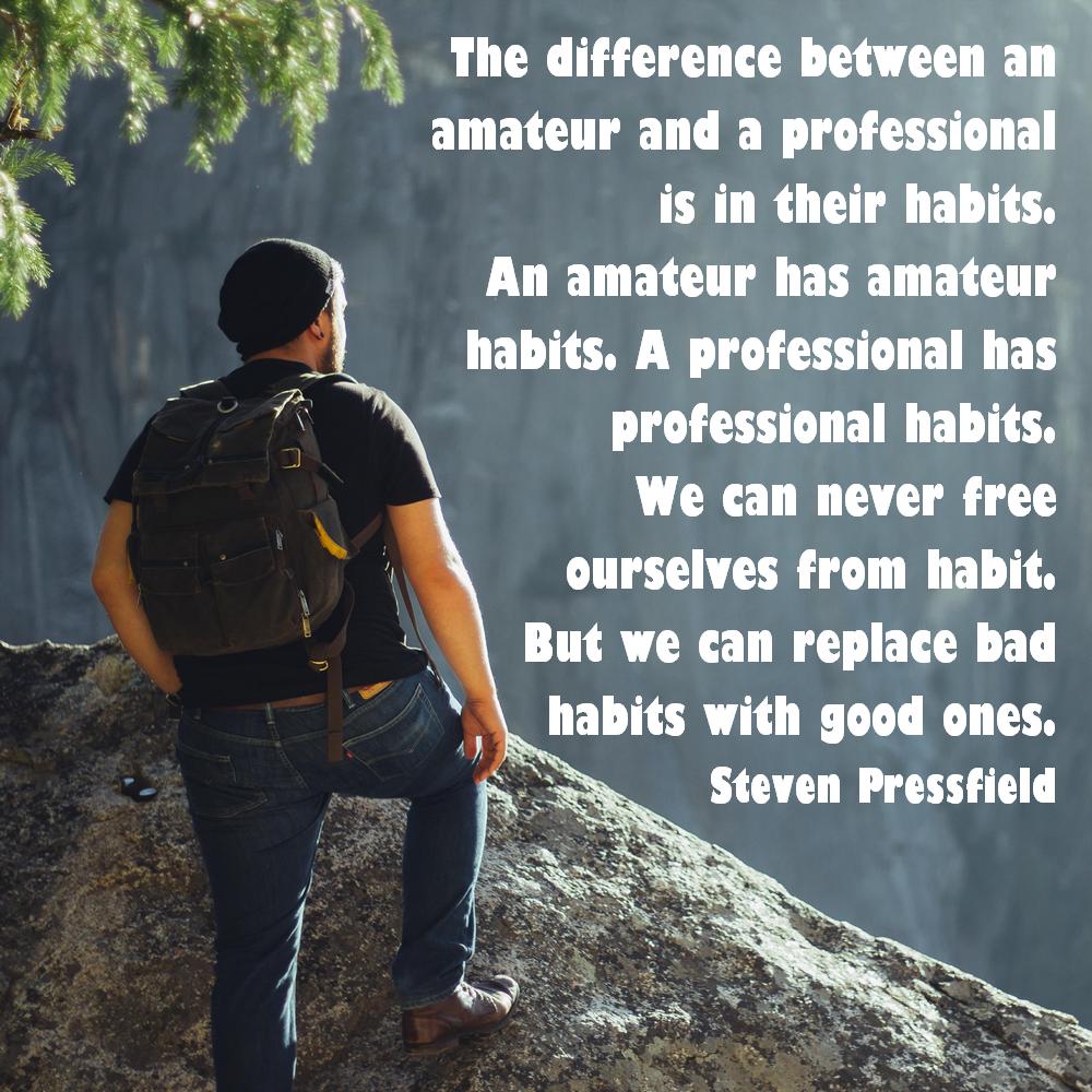 The difference between an amateur and a professional is in their habits. An amateur has amateur habits. A professional has professional habits. We can never free ourselves from habit. But we can replace the bad habits with good ones. – Steven Pressfield
